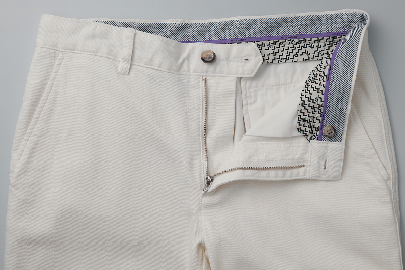 伸縮性のある素材が、長時間の着用でも快適。普段使いから休日スタイルまで幅広く活躍する万能パンツ。